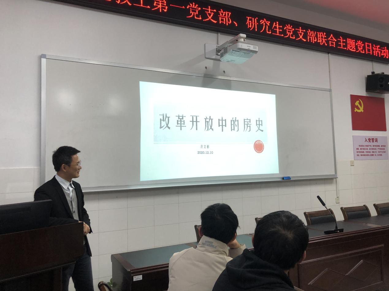 随后,许文彬老师以《改革开放中的房史》为题进行“学四史、三文化”讲微党课活动,他结合自己的成长经历,向大家详细介绍了我国改革开放以来中国房史发展历程,他说我国房屋制度正在逐步完善,目前长沙是全国幸福指数较高的城市之一,希望大家努力学习和工作,珍惜现在的美好生活 。