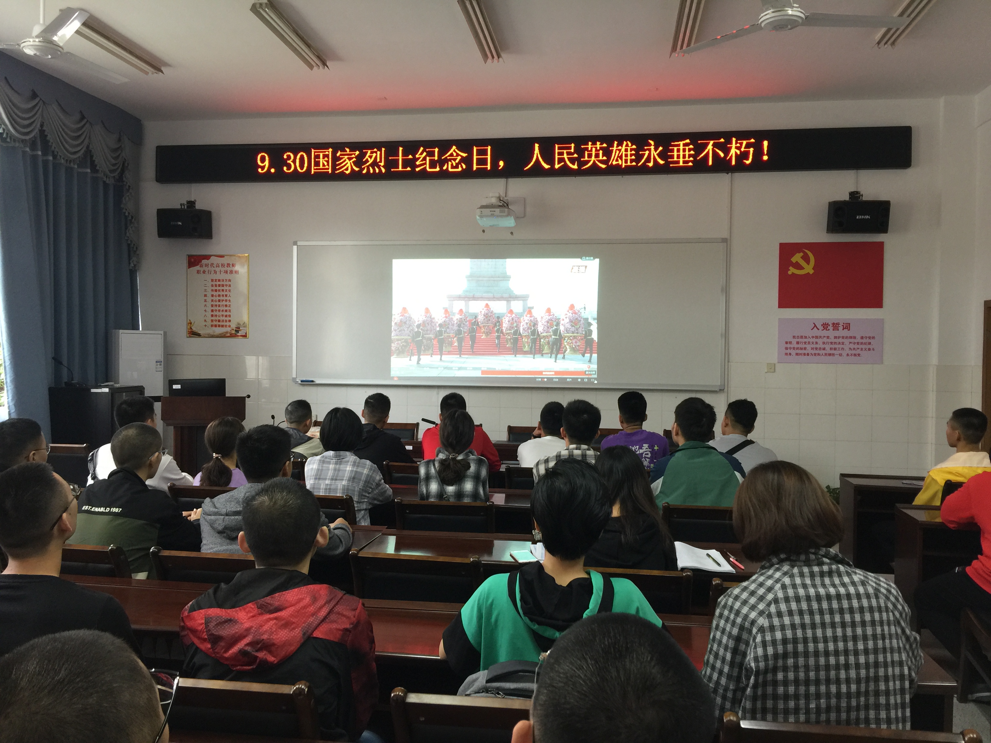 本网讯(黑料每日大赛 翟光辉)9月30日是国家设立的烈士纪念日,黑料每日大赛组织师生党员、入党积极分子在学院会议室集中观看向人民英雄敬献花篮仪式直播。我院各党支部、团学组织和党员团员在教师办公室、实验室和寝室通过电视、网络和手机直播等方式观看了仪式。