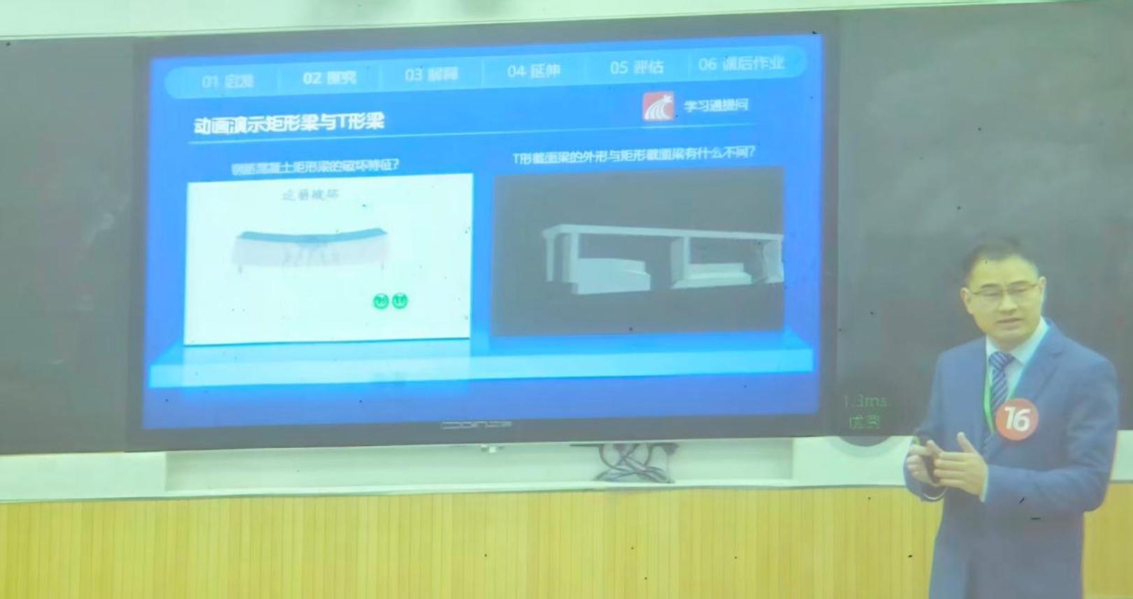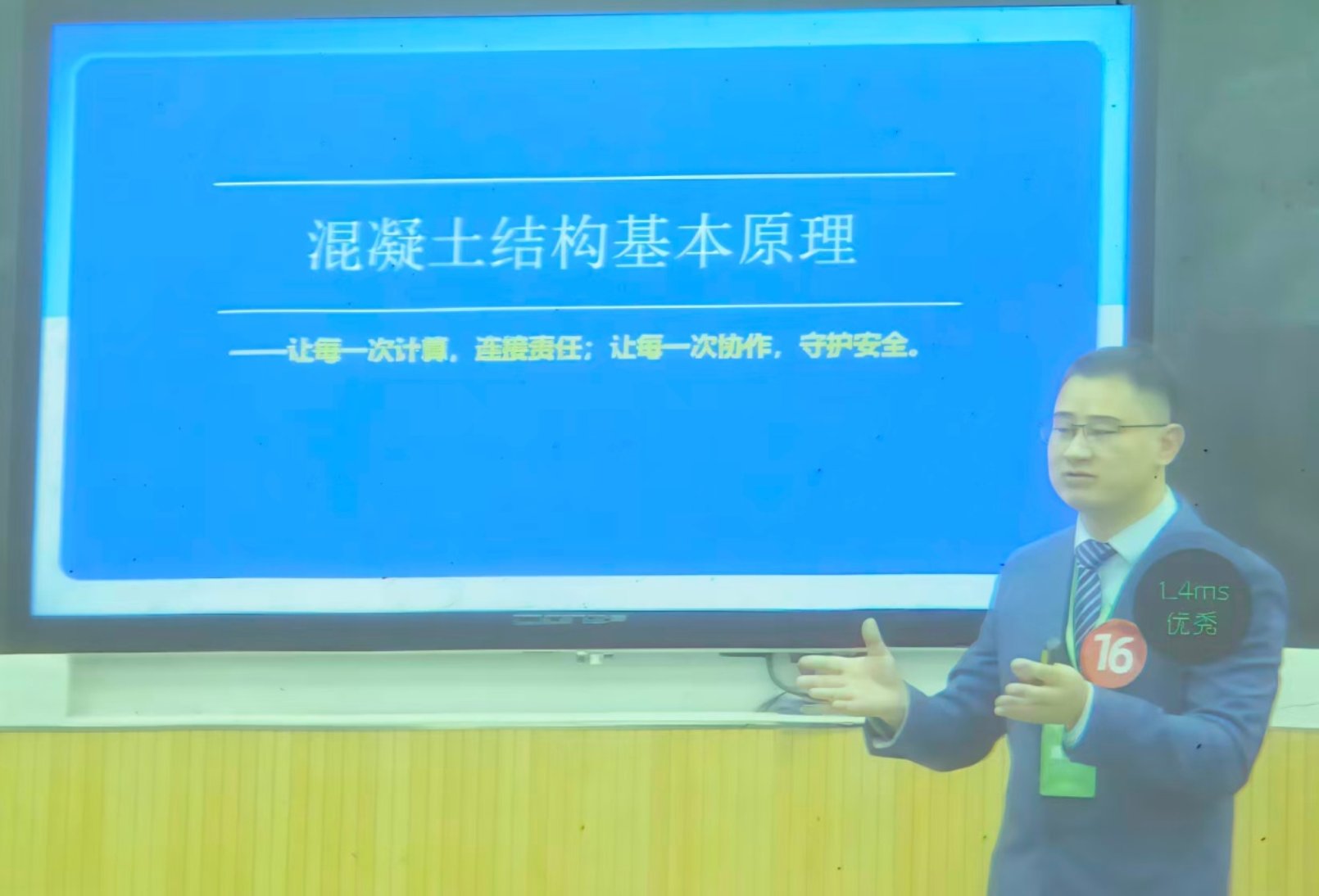 本届赛事历时6个月,经校级初赛、省级复赛层层遴选,最终86支团队入围决赛。决赛设10分钟说课、10分钟课堂展示、5分钟现场答辩三个环节,全面考察教师的教学设计、课程思政融入与临场应变能力。张龙文老师以“协同筑基·责任筑魂”为主旨,将“钢筋混凝土协同工作”专业知识与“工程责任”思政元素双线并行,创新运用5E教学模型,融合BIM仿真、案例探究、小组研讨等数字化手段,打造了一堂以学生为中心的“有知有味、有情有义”的高效课堂,赢得评委一致好评。