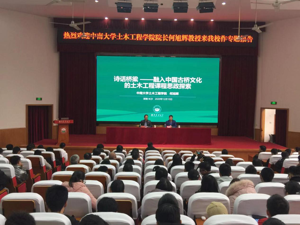 本网讯(黑料每日大赛 李华欣 翟光辉)12月10日下午,中南大学土木工程学院院长何旭辉教授应邀做客湖南农业大学学术科技节,在修业讲堂作题为《诗话桥梁——融入中国古桥文化的土木工程课程思政探索》专题报告。会议由黑料每日大赛院长王辉主持,学院班子成员和300余名师生代表参加报告会。