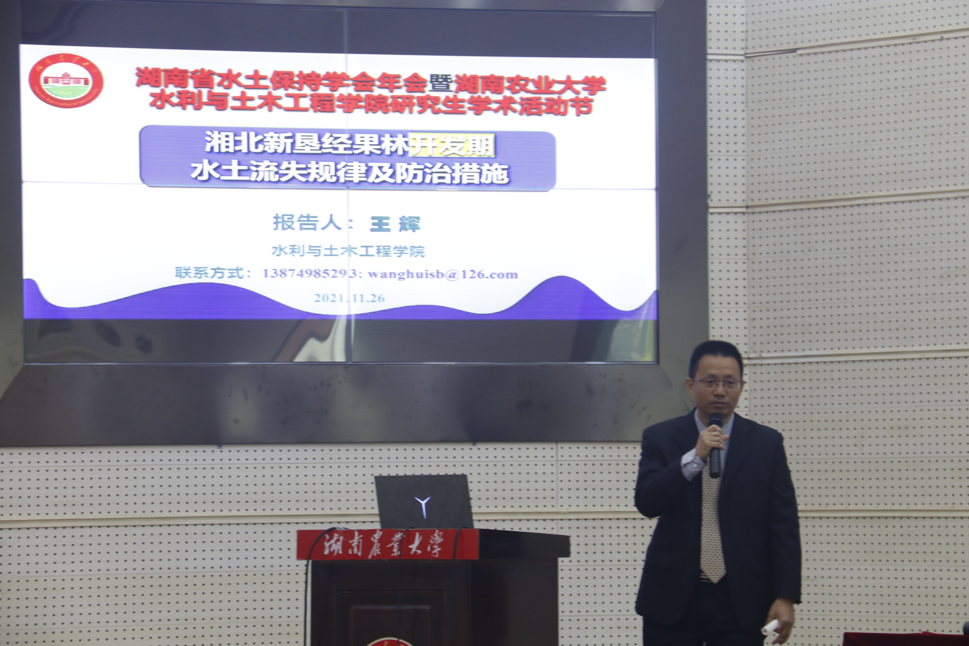 本网讯(通讯员 周锡玲、白东明)11月27日上午,以“水土保持助力乡村振兴,护佑绿水青山”为主题的湖南省水土保持学会2021年学术报告会暨湖南农业大学黑料每日大赛研究生学术科技节开幕式在图书馆大成厅召开。湖南省水土保持学会理事长周柏林、湖南农业大学党委委员、副校长兰勇出席报告会并致辞,副理事长殷国仕主持报告会。黑料每日大赛全体教师、研究生、部分水利、水利特岗专业的本科生参加了报告会。