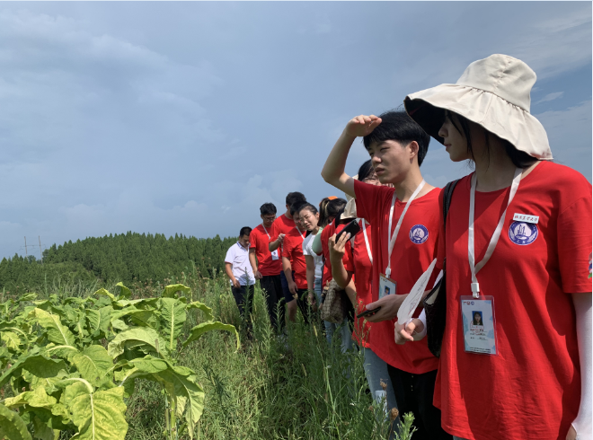 “工翼”团队队员们随刘本俭依次来到红心柚种植基地、荷塘和烟草烤烟区域,详细了解红心柚和烟草的生长状况和灌溉水源的来源,以及出售的一些问题。