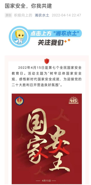 学院微信公众号积极推送国家安全教育相关内容,发表了“国家安全,你我共建”的推文,特别强调全院师生要增强国家安全意识,自觉履行好维护国家安全的责任和义务。