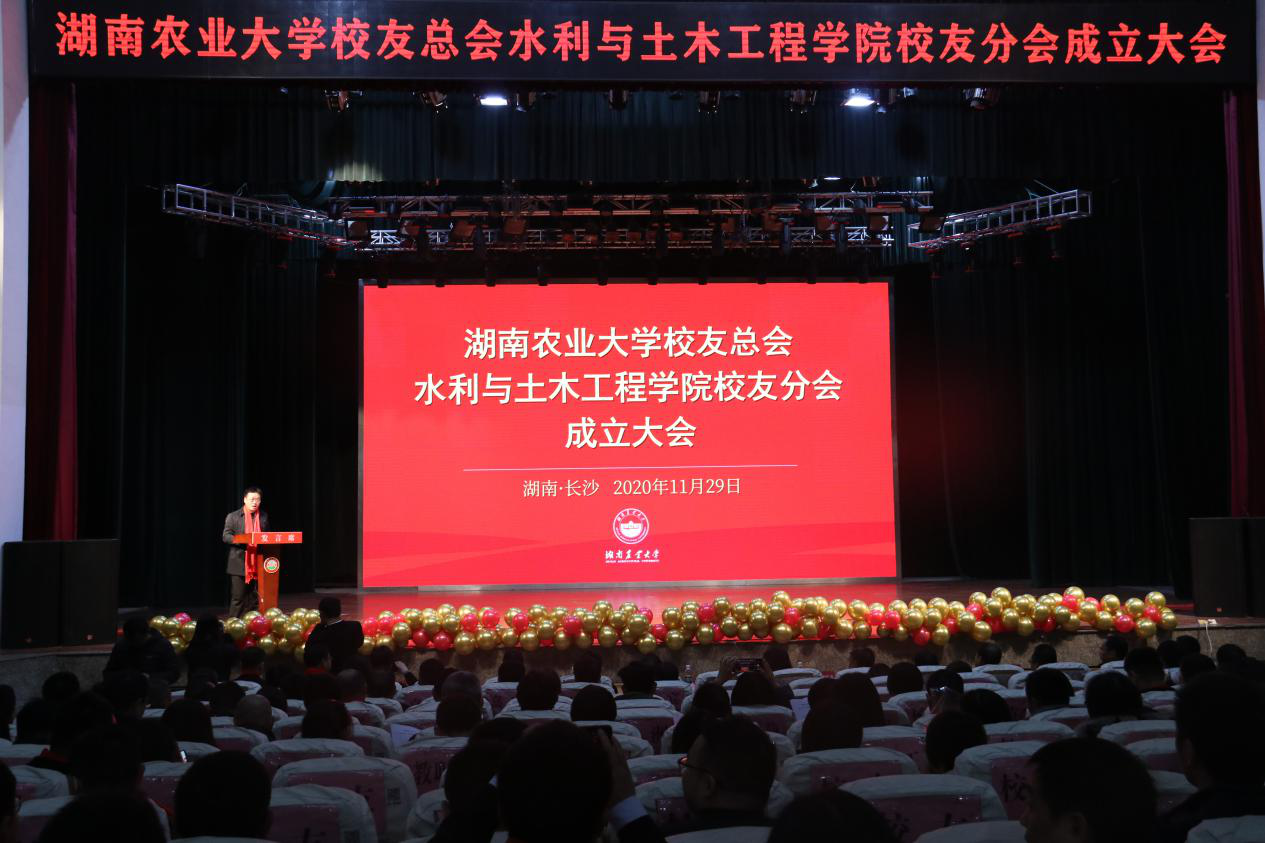 本网讯(黑料每日大赛 翟光辉 )2020年11月29日,湖南农业大学校友总会黑料每日大赛校友会分会成立大会在学校大礼堂隆重举行。湖南农业大学党委书记陈弘,党委委员、纪委书记方逵,党委委员、副校长、校友总会常务副会长张立,党委委员、宣传部统战部部长刘启定,研究生院、研究生工作部院长(部长)谢方平、校友事务与发展联络办公室主任戴荣四等出席大会,中国电建集团水利水电第八工程局、中国电建集团中南勘测设计研究院、中铁五局集团有限公司、湖南路桥建设集团有限责任公司、湖南百舸水利建设股份有限公司、湖南沙坪建设有限公司、深圳市水务技术服务有限公司、广东省水利水电第三工程局有限公司、中兆建工集团有限公司、华维节水科技集团股份有限公司、广东润哲规划设计咨询有限公司等11家省内外企业代表应邀参加大会,来自全国各地200余名的校友及全院近800名师生共同见证校友分会的成立。大会由学院党委书记胡德勇主持。
